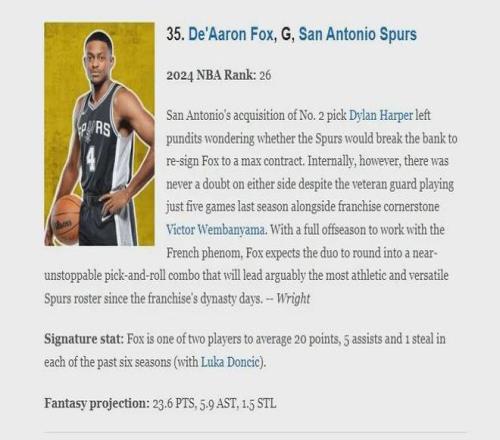 此外在福克斯并不像许多持球大核那样,在防守端有较大短板,本赛季对手场均在其面前出手11.9次,在马刺队内排名第3,仅低于科尔内特17.6次和文班亚马15.3次,可以看出他的防守任务不轻,对手在其防守下命中5.5球命中率达到46.2%,与联盟平均水平基本持平,他虽然不是精英级后场终结者,但对手在他这也讨不到便宜,这对一个承担着组织、得分重任的进攻箭头来说非常难能可贵.